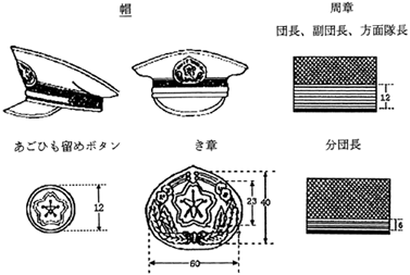 分団長以上の場合には、平しま織金線をつける。 形状及び寸法は、帽と同様とする。 |