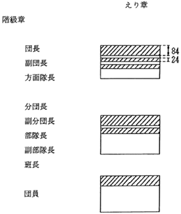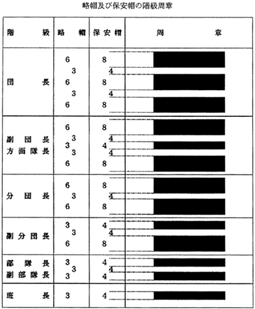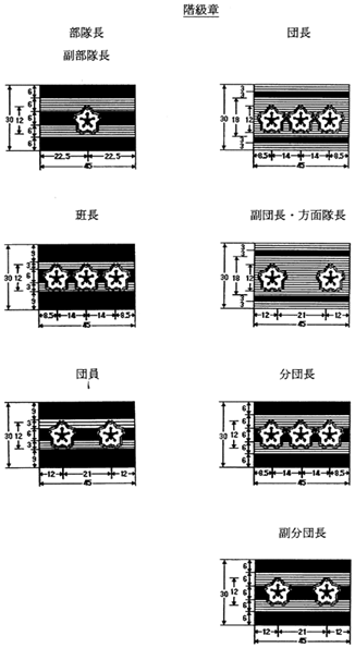 | 団長 | 長さ45ミリメートル、幅30ミリメートルの黒色の台地とし、上下両縁に3ミリメートルの金色平織線、中央に18ミリメートルの金色平織線及び径12ミリメートルの金色消防団き章3個をつけ、甲種衣又は夏上衣の右胸部につける。 | 肩上を中心として前後にまたぎ、首部背縫から両袖の端に至るまで幅約84ミリメートルの赤色平線1条を、更に下方へ幅24ミリメートルの赤色平線2条を後に染め出す。赤色平線の両辺は、すべて3ミリメートル幅の白色平線を染め出す。白色平線の間隔は約15ミリメートルとする。 | |||