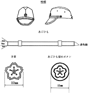 | 略帽 | 地質 | 灰色又は濃紺色の綿織物、合成繊維織物又はこれらの混紡織物とする。 | |||