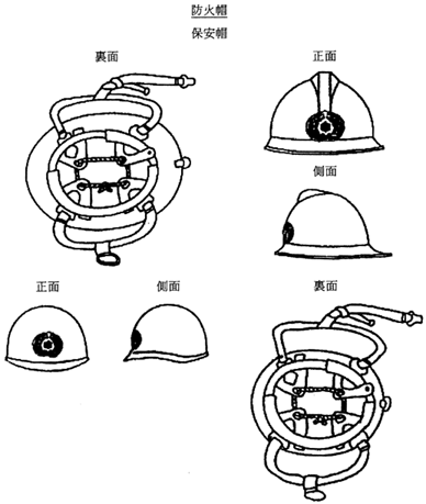 あごひもの両端は、帽の両側において消防団き章をつけた径12ミリメートルの金色ボタン各1個でとめる。天井の両側に各2個のはと目をつけ、通風口とする。 腰は、藤づるあみとし、すべり革には、所要の通風口をつける。 天井の内側には、汚損よけをつける。 形状及び寸法は、帽と同様とする。 |