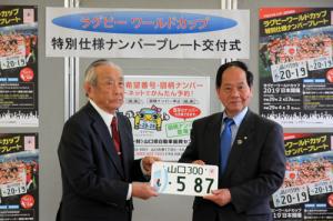 自動車の図柄入りナンバープレート第1弾としてラグビーW杯2019大会を記念した「ラグビーW杯特別仕様ナンバープレート」が交付開始され、市公用車6台のナンバープレートを交換。