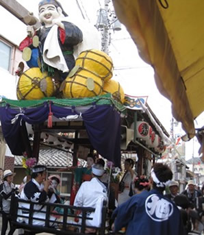 神輿の通った後は山車が回ります。今年は大黒様の飾りをつけた山車でした。町の数個所では、かわいい舞子たちが舞を披露します。山車の後には、少年たちがカミシモを着用し、警固役をつとめます。