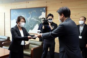 市本庁舎でで新しく教育委員会教育委員となった川端由紀子さんに辞令を交付しました。川端さんは、「小中学校の子どもを持つ親の多くは、教育に対して不安があると思うので、行政との橋渡し役になれれば」と話されました。