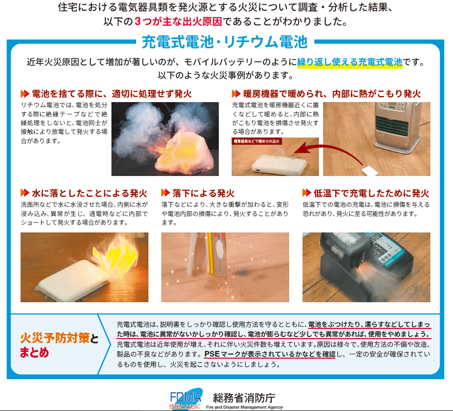 そのため、9月から12月の4か月間を「リチウムイオン電池による火災防止強化キャンペーン」の期間とし、リチウム蓄電池等による火災防止の啓発を強化します。特に11月を「リチウムイオン電池による火災防止月間」とし、周知啓発の強化を図ります。