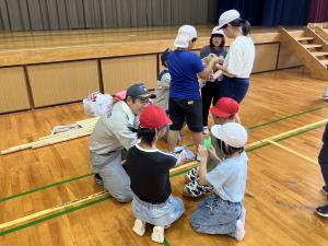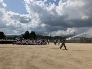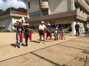 西消防署は、日置地区の小中学生に初期消火訓練と応急手当を指導しました。