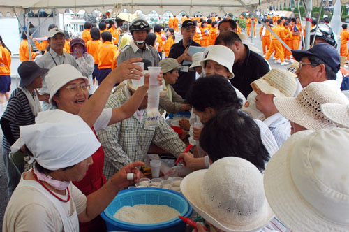 8月23日(日)、三隅野波瀬漁港で平成21年度沿岸海域合同訓練が行われました。これは地震などの大規模な災害が発生したときに、地域住民と防災関係機関の連携による避難・救助・災害拡大防止の訓練を実施することで、協力体制の強化と地域住民の防災意識を高めるため、長門市、仙崎海上保安部、長門警察署、長門市消防本部が共催して毎年行われているものです。 今回は、野波瀬沖で大きな地震が発生したという想定で訓練が行われ、総勢300人余りの関係者や市民が参加しました。地震で海に転落した人をヘリコプターで救助したり、倒壊した家や車に閉じ込められた人を救助したりする訓練が関係機関との連携を確認しながら行われました。この他、住民避難訓練や炊き出し訓練も行われました。訓練の後の防災フェアでは、地震体験車や消防防災ヘリコプターの展示などが行われ、それぞれ人だかりができていました。