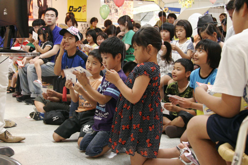 6月23日(土)、おいでませ!山口国体開催100日前イベントがフジ長門店で開かれました。これは、国体開催まで100日を切ったことから、同長門市実行委員会が市民に向けて広く国体をprするために主催したもので、さまざまなイベントやグッズ販売、ぬりえコーナーなどが企画され、会場にはたくさんの親子連れが集まりました。 山口国体のマスコットキャラクター、ちょるるの絵柄をそろえるビンゴ大会では、集まった子どもたちの「ちょるる?!」という大きな呼び声とともに、ちょるるが登場。子どもたちは一斉にちょるるを取り囲み、抱きついたり握手したりして大喜びしました。ビンゴが始まると、景品のちょるる人形やピンバッジをもらおうと、真剣な表情でビンゴカードを見つめ、絵柄が発表される度に大歓声が起きるなど、大いに盛り上がりました。