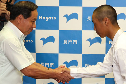 8月20日(月曜日)、第57回全国高等学校軟式野球選手権大会に出場する大津・大津緑洋高校軟式野球部の激励会が長門市役所でありました。大津・大津緑洋高校軟式野球部は8月8日に柳井市のビジコム柳井スタジアムで行われた第57回全国高校軟式野球選手権西中国大会決勝で広島商(広島)を1−0で破り、2年連続13回目の優勝を果たしました。 激励会でははじめに大西市長が「大津高校は65年の歴史に幕を閉じるが、その歴史にふさわしい結果を期待しています」と激励の言葉を述べました。その後、大西市長より激励費を受け取った大田惇貴主将が「地域の皆さんへの感謝の気持ちを忘れずに全員野球で全国制覇を目指します」と意気込みを述べました。 なお、大津・大津緑洋軟式野球部は、23日(木曜日)に市役所南側玄関前で出発式が行われ、兵庫県明石市へ向け出発し、26日(日曜日)に高砂市野球場で宮城県の気仙沼高校と対戦します。