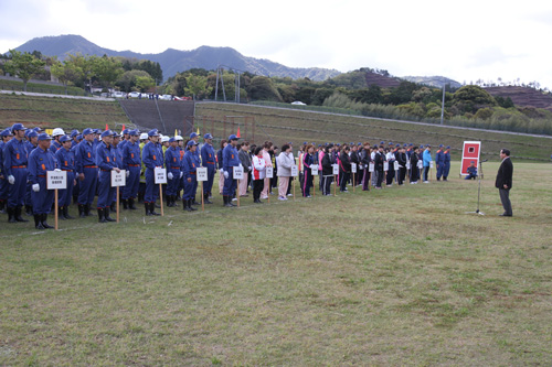 4月21日(日)、ラポールゆやグラウンドで第7回長門市消防操法大会が行われました。この大会は、消防や初期消火の技術向上と団員の意識高揚を目的に開催されているものです。 消防団員による応急操法の部には9部隊約100人が、婦人防火クラブなどによる水バケツ消火技術の部には11チーム約100人が参加しました。 応急操法は、決められたコースを素早く、かつ正確に操作しながら進み、的であるコーンを水で落とすというもので、4人1組で行いました。どのチームも練習の成果を十分に発揮し、機敏に操作を行っていました。 水バケツ消火技術の部には、職場ごとに作られたチームで参加し、バケツに水を汲んで火点に設定された的に水をかけ、一定量かけることができるまでの時間の短さを競いました。 結果は以下のとおりです。(3位まで) ; min-height: 24px 応急操法の部 1位 日置方面隊日置分団第2部隊 2位 三隅方面隊第3分団小島部隊 3位 油谷方面隊宇津賀分団後畑部隊 ; min-height: 24px 水バケツの部 1位 明和倶楽部 2位 参ったか、aedも設置済み(へき楽園) 3位 岡田病院 火消し隊