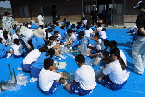 9月28(土)、大浜海岸で菱海中学校全校生徒による海辺の漂着物調査が行われました。 これは、地元の子どもたちが主体となって海辺の漂着物を回収・分別して海岸の汚染実態を調査することにより「ごみを捨てない心、海の環境を守ろうとする心を育む」ことを目的に実施されているものです。 この日は、菱海中学校の生徒やpta、地元住民、市職員など220人が参加し、大浜海岸で10m四方の区画内のごみを拾いました。拾ったごみは駐車場に持ち帰り、種類(木、プラスチック、ゴムなど)や国別に分けて重さを量ったり数を数えたりしました。 なお、調査の結果、区画内で採取したごみの量は、4,186個(18,613g)でした。
