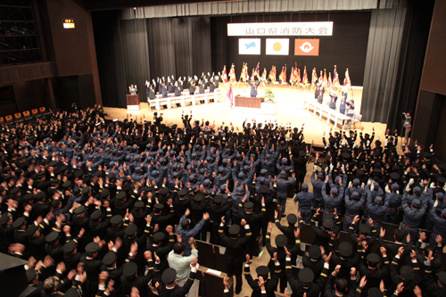 10月26日(土)、ルネッサながとで自治体消防第65周年記念山口県消防大会が開催されました。 これは、県内の消防関係者が消防の使命を改めて認識し、今後の消防防火体制の強化と地域の安心・安全を図ろうと開かれました。 大会式典には、県下19市町の消防団員や12の消防本部職員、消防関係者など約800人が参加しました。 式典では初めに消防殉職者、物故者に対する黙祷が行われました。続いて、開催市を代表して大西市長が「消防団は地域になくてはならない存在。いつどこで起きるかわからない災害に対し、地域の要となって市民の生命、財産を守ってほしい」とあいさつをしました。また、安倍首相からビデオメッセージが届けられ「市民の安心安全を守るのは行政のいちばんの仕事です。日々の訓練を怠らないようこれからもよろしくお願いします」と消防関係者を激励しました。 来賓祝辞の後、表彰式が行われ、3団体15人に賞状や記念品が贈られた後、大会決議が読み上げられ、万歳三唱で式が閉じられました。 式典終了後には、山口市と下関市による事例報告が行われ、7月28日に発生した大雨災害における対応についての報告やマスコットキャラクターを使った消防団員の入団促進についての事例発表が行われました。また、「地域防災猟区の向上?消防団の果たす役割?」と題した山口大学の瀧本浩一さんによる記念講演が行われ、参加者は、消防の必要性を再認識しました。