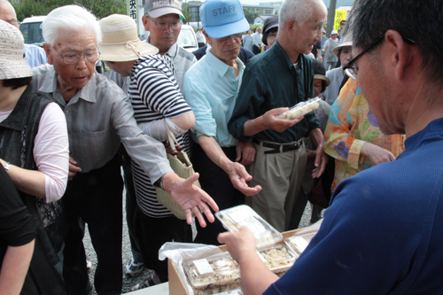 6月29日(日)、三隅中村にあるアグリ中央市場農産物直売所で「泥おとし祭」が行われました。これは、10haあるほ場の田植えを無事に終え、「泥おとし」の季節を迎えたことから農事組合法人アグリ中央の主催で行われたものです。 この泥おとしとは、田植えが終わると、その労をねぎらうために休日を設け、持ち寄った料理を囲んで、団らんのひとときを過ごすことです。 直売所では、農事組合法人アグリ中央が生産した米で作った炊き込みご飯の無料配布が行われたほか、100円で袋にたまねぎをつめ放題できるコーナーやいぎの葉餅、おはぎや寿司などの販売が行われ、たくさんのお客さんで賑わいました。