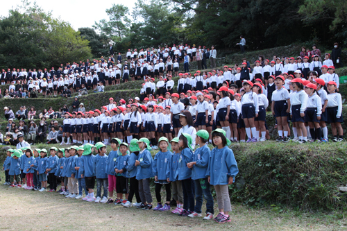 10月16日(木)、東深川の赤崎神社楽桟敷で深川小学校児童による桟敷集会が行われました。 この集会は、楽桟敷で歌を歌うなどしてお互いの表現のよさを見つけるとともに、楽桟敷という文化遺産に触れることで先人の思いや野外劇場のすばらしさを感得しようと平成10年から毎年開かれているものです。 集会では、まず全校児童548人と見学に訪れた東深川保育園の年長園児で「もみじ」を合唱しました。続いて学年ごとに詩の朗読や合唱を行いました。最後の桟敷集会となる6年生は、コンクールで披露する「cosmos」を合唱。高音と低音のきれいなハーモニーが楽桟敷に響き渡りました。 学年発表の後、深川っ子のゆめと題して児童を代表した8人が全校児童の前で「深川小学校の先生になりたい」「イルカの調教師になりたい」「アナウンサーになって見ている人に笑顔を届けたい」など夢を大きな声で発表しました。 発表を終えた児童は「大きな声で気持ちが伝わるように歌えた」「全国でも数少ない楽桟敷で発表できるということは素晴らしいこと」など感想を述べました。