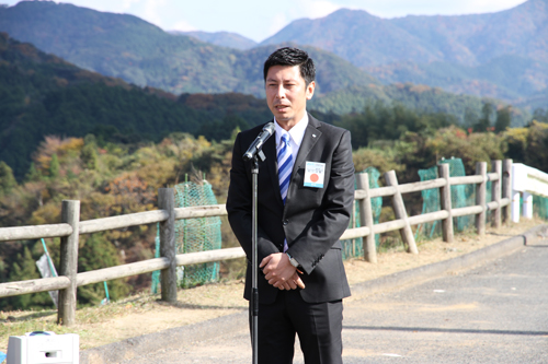 11月22日(土)、長門青年会議所が創立50周年を記念して行う「ながとさくら街道in俵山」のパネル除幕式が俵山スパスタジアム駐車場で行われました。長門市の花が桜であること、全日本ラグビーのエンブレムデザインが桜であること、同会議所と姉妹締結している韓国の鎮海市が桜で有名であることから、スパスタジアムの法面を覆い尽くすように密生するシバザクラが選ばれました。 同会議所の前川佳賢理事長は、「昨年はスパトライアスロン、一昨年はフォトロゲイニングと、大変お世話になった俵山をもっと盛り上げたいと考え、今回の事業を実施しました。俵山はシャクナゲやツツジが楽しめますが、このシバザクラが見頃になる5月末まで続けて花が楽しめるようになると思います。また、これから5年後、2019ラグビーワールドカップのキャンプ地になった時には、きれいな花が選手や関係者を迎えられると思います。これからもシバザクラの植栽を継続して行っていきたいと思います」と話しました。 大西市長は、「俵山に新たな名所ができ、感謝しています。ラグビーワールドカップのキャンプ地誘致のはずみにして、世界のラグビーチームを呼び込んでいきたいと思います」とお礼を述べました。 続いて、関係者で「長門さくら街道in俵山」の記念パネルの除幕が行われ、その周辺にシバザクラが植栽されました。 この「ながとさくら街道in俵山」は、同会議所が俵山地区を盛り上げ、今後5年間かけて俵山をフラワーパークにしようとする取り組みで、2019年の春、満開のシバザクラが咲くことを目標としています。11月8日には、9,000株のシバザクラが植えられました。