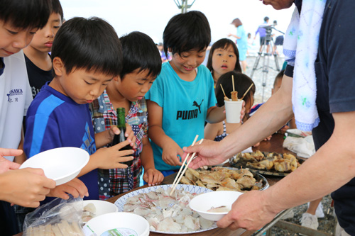 7月4日(土)、深川川の河口付近で、長門ヨットフェスタ2015の関連イベントであるマリン塾「地引網体験スクール」が行われました。 これは、長門市の美しい海を広く知ってもらおうと長門ヨットフェスタ2015実行委員会が主催して毎年開催しているもので、この日は親子や中学生など約100人が参加しました。開会式では、実行委員会から、ヒレに毒を持つなど危険な魚について説明があり、獲れた魚にすぐには触らないよう呼びかけが行われました。 地引網の体験では、2つのグループに分かれて一列に並び、声をかけ合いながら力いっぱい網を引きました。引き揚げられた網の中には、タイやスズキ、アジやカワハギなどたくさんの魚が入っていて、子どもたちは元気に飛び跳ねる魚に驚いていました。 その後、用意されたアラを使った味噌汁、刺身や唐揚げ、焼き鳥とイカ焼きを参加者は美味しそうにほおばっていました。