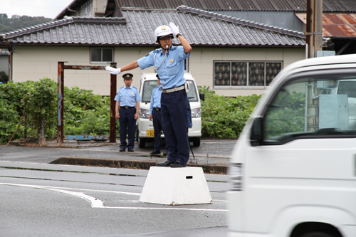 9月8日(火)、長門警察署前の交差点で手信号訓練が行われました。 この訓練は、これから本格的な台風シーズンを迎えるにあたり、停電などによって信号が消えた状況を想定して実施されたもので、勤務年数が3~9年の若手警察官など約10人が参加しました。 はじめに、長門警察署の楠純二署長が「8月25日に接近した台風15号に続き、今は17号、18号にも注意しなくてはならない状況にあります。今日は大きく正確な動作と、流れを十分確認しての交通整理を心がけてください」と話しました。 駐車場で動作を確認した後、参加した警察官は交差点の中心に立ち、実際に信号を消して手信号による交通整理を行いました。