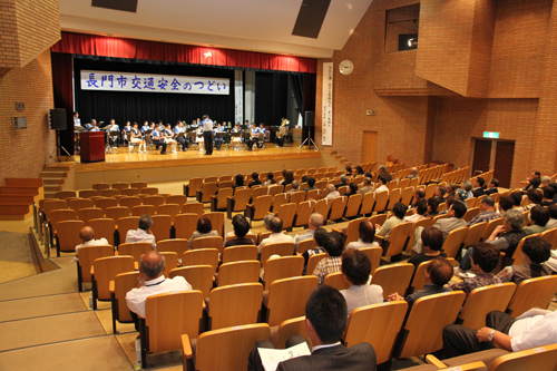 9月21日から始まった秋の全国交通安全運動にあわせ、9月24日(木)、長門市中央公民館で長門市交通安全のつどいが開催され、長門交通安全協会、長門安全運転管理者協会などの会員など約150人が参加しました。 式典であいさつに立った大西市長は、「交通事故は誰もが加害者にも被害者にもなり得ますが、長門市では高齢化が進み、件数などは例年と同じ程度となっていますが、高齢者が被害者になる事故が多く起こっています。高齢者の生活が、車がなくても成り立つように支えていくことも市役所の仕事であり、そのためのデマンド交通も俵山や向津具で始まっています。交通事故のない安心して生活できる長門市にしたいと思っています」と話しました。また、楠純二長門警察署長は、「今年は物損事故、人身事故、負傷者数いずれも、昨年同期よりも減少しています。死亡事故は統計上ゼロですが、1名が事故後24時間以降に亡くなっています。悲惨な交通事故は家族を始めいろいろな人を不幸にします。長門市は高齢化が進んでおり、長門署では高齢者の運転中・歩行中の事故、スピードの出し過ぎによる事故の2つの事故を防止するための取り組みを進めていきます」とあいさつしました。 交通アテンダントが交代し、引き継ぎ式が行われた後、交通安全に関する表彰が行われ、交通安全スローガンを考えた児童3人、中国5県表彰の交通安全功労者である濱永寛さんを始め、山口県表彰に3人が、地区表彰による交通安全功労者、優良運転者、優良安全運転管理者など11人に表彰状が贈られました。 長門市交通安全母の会の大嶋禮子会長が大会宣言を読み上げた後、県警音楽隊による演奏会が行われました。参加者はその音楽に耳を傾けていました。予定されていた交通安全パレードは雨のために中止となりました。