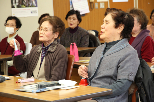 12月18日(金)、長門市物産観光センターで、深川友愛学級の「学ぼう会」が行われました。 長門市中央公民館の高齢者学級である「深川友愛学級」では、定期的に「学ぼう会」と呼ばれる集まりが企画されています。今回は、年末にあたって交通事故やうそ電話詐欺の防止策を学ぶとともに、童謡やハンドベルの演奏などを楽しむことを目的に催され、メンバーのうち約30人が参加しました。 会ではまず、長門警察署の劇団「長門治安マモローゼ」の寸劇を交えながら講義が行われました。県内では、ここ最近詐欺被害が増加しているほか、10月には市内でも架空請求の事件が発生しています。マイナンバーや口座情報などを電話で聞き出そうとするケースもあり、「電話に出ない」「電話帳に載せない」「電話で長く話さない」の「3ない運動」を推進するよう参加者に呼びかけがありました。また交通事故防止策として、反射材の活用方法や自転車の安全な乗り方なども紹介されました。 講義を終えて、深川友愛学級の三戸久子委員長は「交通事故に関して、私たちは加害者にも、被害者にもなりうることが分かりました。細かく、笑いを交えながら教えていただき、ありがとうございました」とお礼の言葉を述べました。 その後、深川地区で活動を続ける山田啓子さんにより、童謡にあわせた体ほぐしの運動やクイズ、サンタクロースにふんした公民館職員を加えてのハンドベルの演奏などが行われ、参加者はクリスマス気分を味わいながら、今年最後の「学ぼう会」を楽しみました。