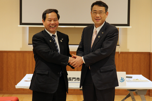 下関市と長門市の市長会談が1月14日(木)、下関市の次世代育成拠点施設「ふくふくこども館」で行われ、中尾友昭下関市長と大西市長がサイクルイベントや交通体系、栽培漁業の推進などについて協議を行いました。この両市長会談は、平成 17年にそれぞれの市が合併し隣接したことをきっかけに始まり、今回で11回目となります。 サイクルイベントについては、来年度第10回の節目を迎える「ツール・ド・しものせき」の記念事業として、両市を巡回するコースを設定することになりました。両市の共催で、これまでのロングコース130kmよりも長い160kmのコースを「センチュリーコース」として新設、長門市の大浜海岸周辺を通り、下関市に4ヵ所、長門市に1ヵ所のエイドポイントを設置し両市ならではのおもてなしを行うことで、交流人口の拡大と両市の連携を一層推進することについて合意しました。 また、長門市でも平成28年度秋頃に、下関市を通るコースのサイクルイベントを予定しており、これについても連携していくことで合意しました。 交通体系については、利用者が減少傾向にあるjr山陰本線の利用促進としてくじらヘッドマーク付きの列車を走らせくじら文化をprし山陰本線の利用促進に努めていますが、このたび「jr山陰本線pr動画」が共同制作され、記者会見の場で初披露されました。この動画は、沿線風景の美しさや沿線の人々の生活を映像化しており、jr山陰本線を利用してほしいというメッセージが込められているもので、今後、ネット上での公開が予定されています。 山陰道「長門・下関間」の早期実現に向けた要望活動についても話し合われ、昨年4月に優先整備区間として「三隅~長門間」「俵山~豊田間」が選定されていますが、今後も「長門・下関間」の早期開通を目指し、要望活動や市民への啓発活動を進めていくことを確認しました。 栽培漁業の推進については、キジハタ種苗の放流やアワビの中間育成を今後も継続して取り組んでいくことを確認しました。 最後に中尾下関市長と大西市長が握手し、今後とも両市がさまざまな政策で連携していくことをあらためてアピールしました。