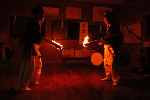 地域の子どもからお年寄りの多くの人が見守る中、兎渡谷神楽舞の演目は、「足馴らし」から始まり、天上のから釣り下がる飾りを操る「天涯」や、弓を使用した「当社」、剣を持ち乱舞する「四剣」など様々な舞が披露されました。終盤には、松明(たいまつ)に火を灯し舞う「火の舞」も披露され、大いに盛り上がりました。