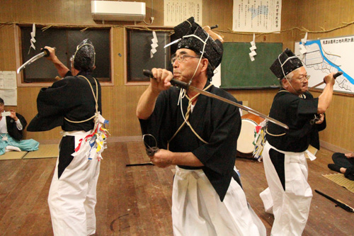 兎渡谷神楽舞は、五穀豊饒や牛馬の安全祈願などを願い奉納されるもので、現在、13名の兎渡谷神楽舞保存会により、保存・継承が行われています。この日は、24種類あるとされる舞のうち、11種類が奉納されました。