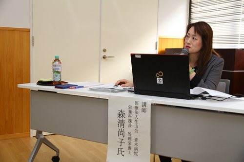 開会にあたり、長門市役所の市民福祉部 川野美智明部長が、「本日は、現代の食生活、食習慣に即して、どのようにしたら上手に工夫して摂取できるのかというお話をされますので、しっかりと聞いていただき、これからの生活に役立ててください」と挨拶。その後、医療法人生山会 斎木病院の管理栄養士森清尚子氏が、「バランスのとれた食事のために~間食・捕食・中食・外食について」と題し、食事に重点をおいて講演されました。