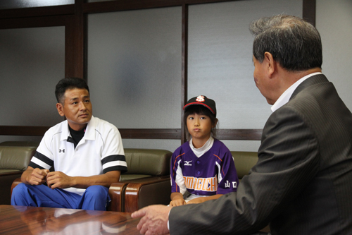 大西市長のもとを訪れたのは、「全日本女子学童軟式野球大会 NPBガールズトーナメント2019」に出場する油谷小学校5年生の岡藤美瑠さんです。