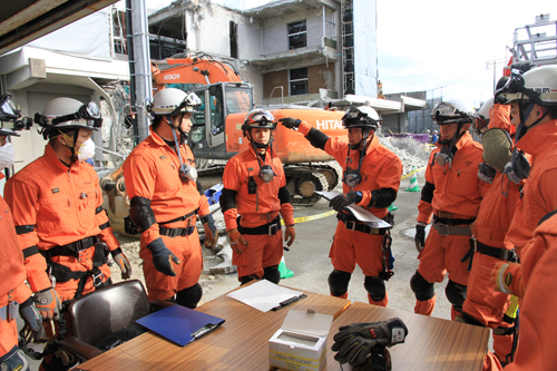 訓練は地震によりRC造の共同住宅が倒壊して居住者が閉じ込められたり、行方不明になったりしていることを想定し、進められました。要救助者の検索訓練や建物内の侵入訓練が行われ、建物2階から穴を開けて1階の要救助者を救出する訓練などが行われました。