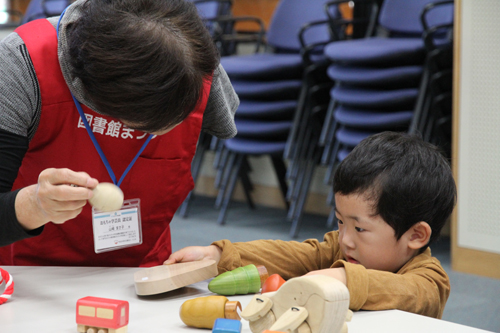 館内外では子どもたちが楽しめるイベントが用意されており、天候も良かったことから屋外では絵本の読み聞かせやスーパーシャボン玉づくりが、屋内では木のおもちゃに触れ合う木育コーナーや折り紙教室、あやとり教室などが開催され、多くの子どもたちでにぎわっていました。