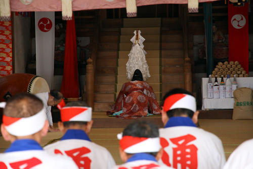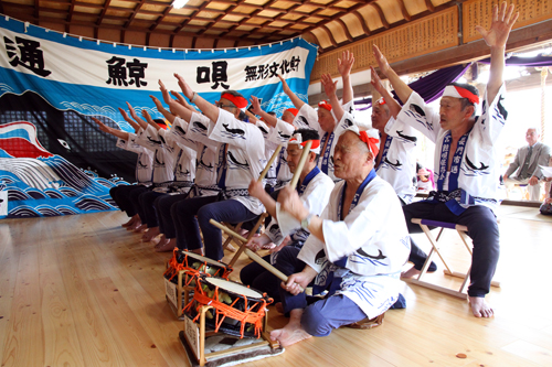 三隅八幡宮は4月と9月に例祭(大祭)が行われ、今回は通鯨唄保存会が招かれ通鯨唄を奉納しました。これは、古来より鯨漁師の崇拝が篤く、捕鯨銛や鯨の髭が奉納されており、かつて氏子であった所縁があって実現したものです。ここでは、「祝え目出度」・「朝のめざめ」の2曲が奉納され、13人の声が境内に響きわたり、祭を盛り上げました。