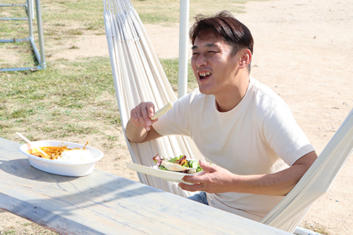 会場には棚田で栽培されたハーブを使用したオリジナルのやきとりやカレー、ジェラートなどが販売され、イベントを訪れた人たちは美しい景色を見ながら楽しんでいました。