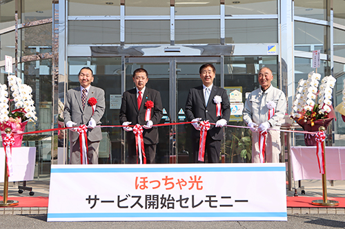 セレモニーでは、江原市長が「市民の皆さんのより良い生活のために役立て、幅広く活用されることを期待しています」とあいさつし、サービス開始を記念したテープカットが行われました。セレモニーの終了後、江原市長は”ほっちゃ光”のサービスを実際に体感し、通信速度の速さに驚く場面も見られました。