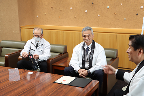4月16日(火曜日)、長門市役所で深川養鶏農業協同組合の末永明典組合長と時澤哲夫総合企画部長が、長州黒かしわGI登録に伴い、江原市長を表敬訪問しました。